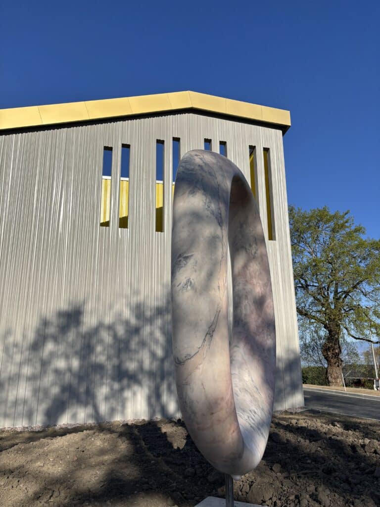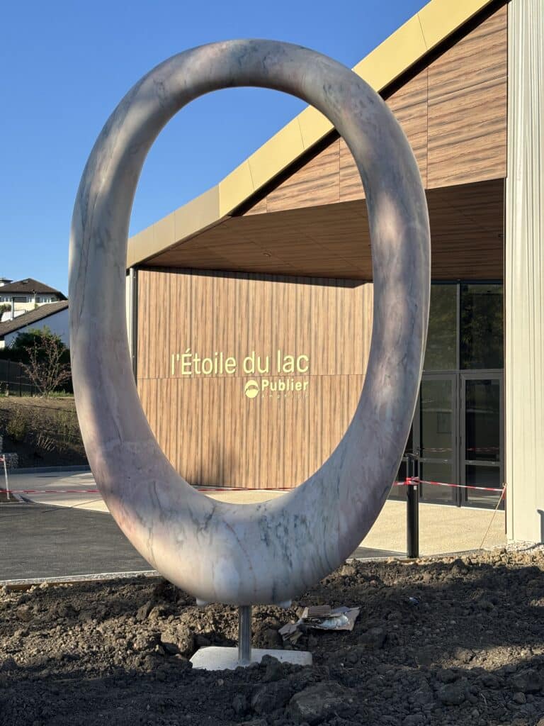Œuvre en marbre d’Estremoz, Le Point d’Origine a été choisi pour donner une dimension artistique au projet de construction de la nouvelle salle des fêtes l’Étoile du lac. La sculpture a été installée le jeudi 9 avril en présence de son auteur Amir Roti et de l’architecte Yohann Forel du cabinet de Thonon 58 bis Architectes. Attachée à rendre l’art accessible à tous les publics, la municipalité de Publier a fait le choix d’appliquer pour ce projet le 1% artistique. Situé à l’entrée du bâtiment, Le Point d’Origine offre aux visiteurs une nouvelle expérience et éveille la curiosité.