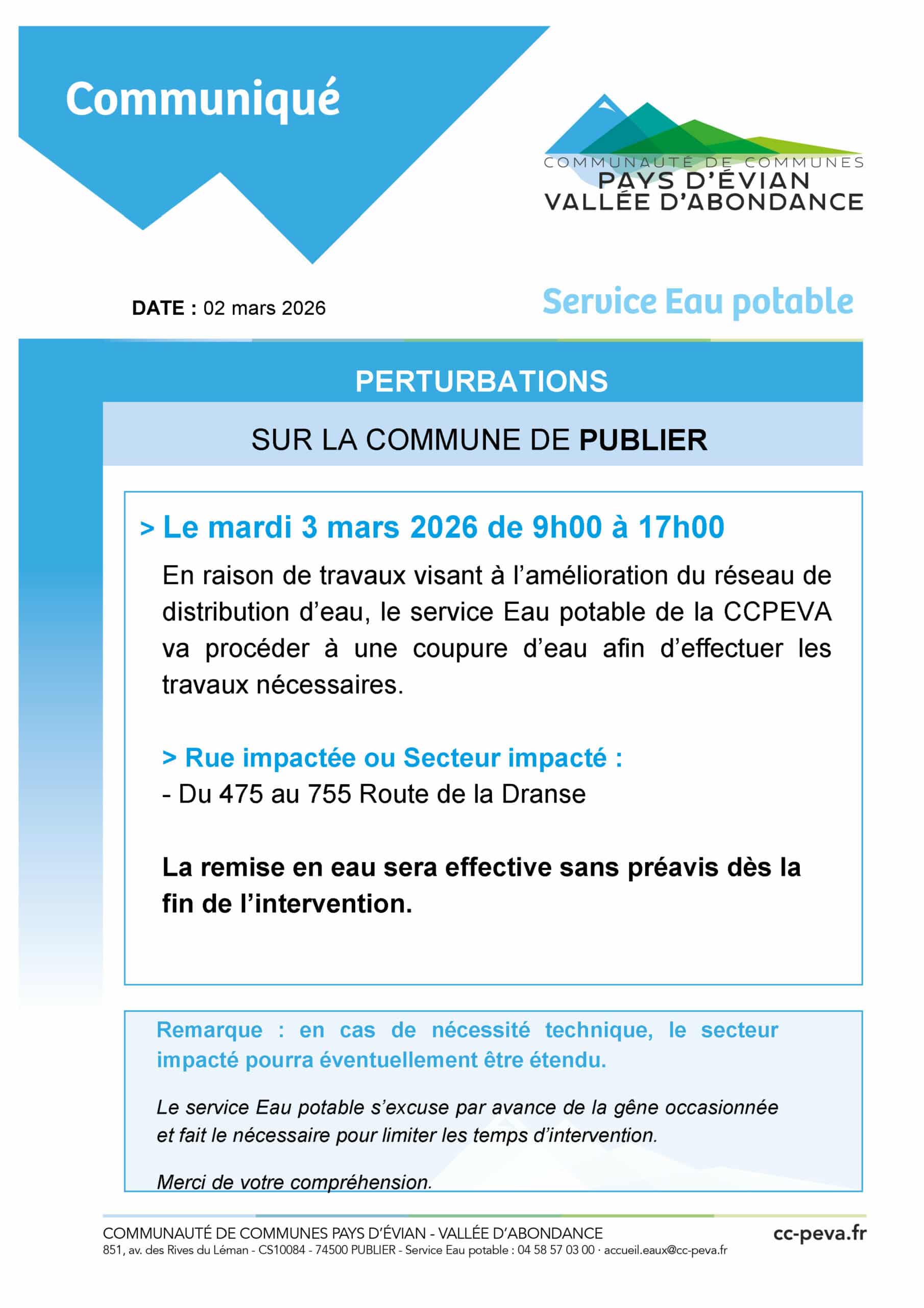 Coupure d’eau route de la Dranse le 3 mars / Actualités / Par Service Communication Coupure d'eau Voir toutes les actualités