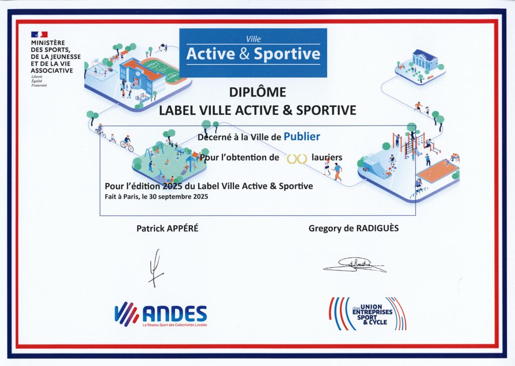 Depuis le 30 octobre, Publier fait partie du millier de communes en France récipiendaires du label « Ville Active et Sportive » qui valorise la politique sportive de la commune, son service des sports et ses équipements sportifs.