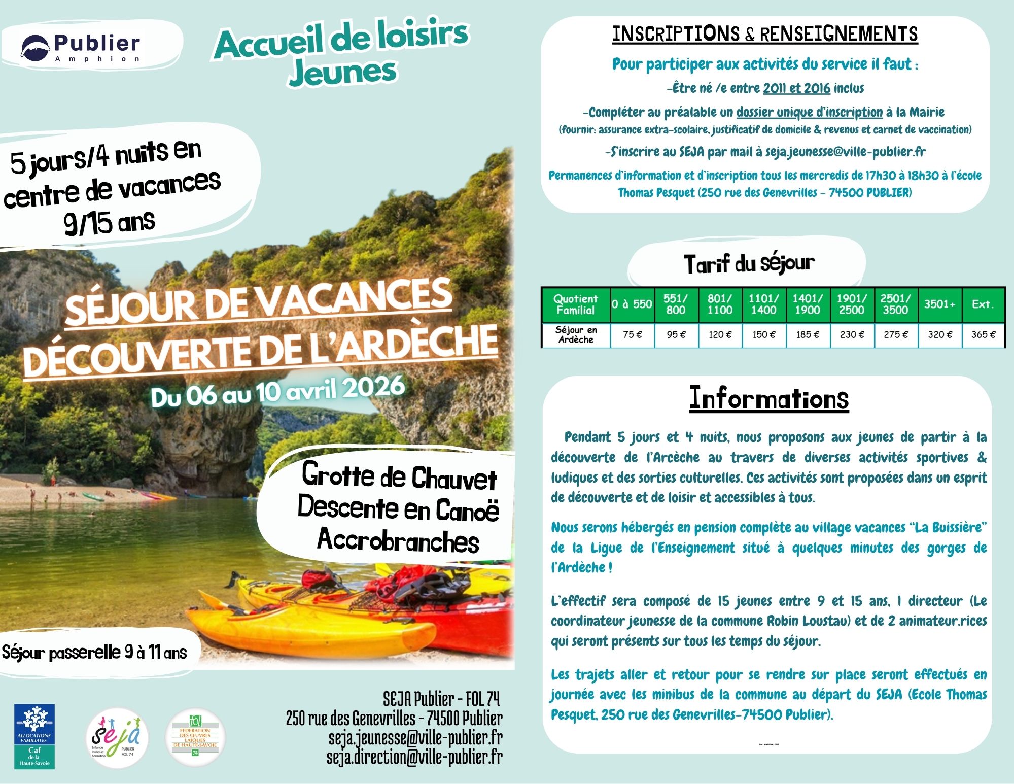 Inscriptions par courriel à seja.jeunesse@ville-publier.fr. Permanences d’information et d’inscription le mercredi de 17h30 à 18h30 à l’école Thomas Pesquet (250 rue des Genevrilles).