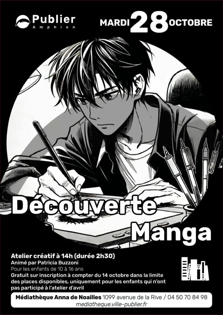 La médiathèque Anna de Noailles propose un atelier découverte manga pour les enfants de 10 à 16 ans le mardi 28 octobre à 14h animé par Patricia Buzzoni.