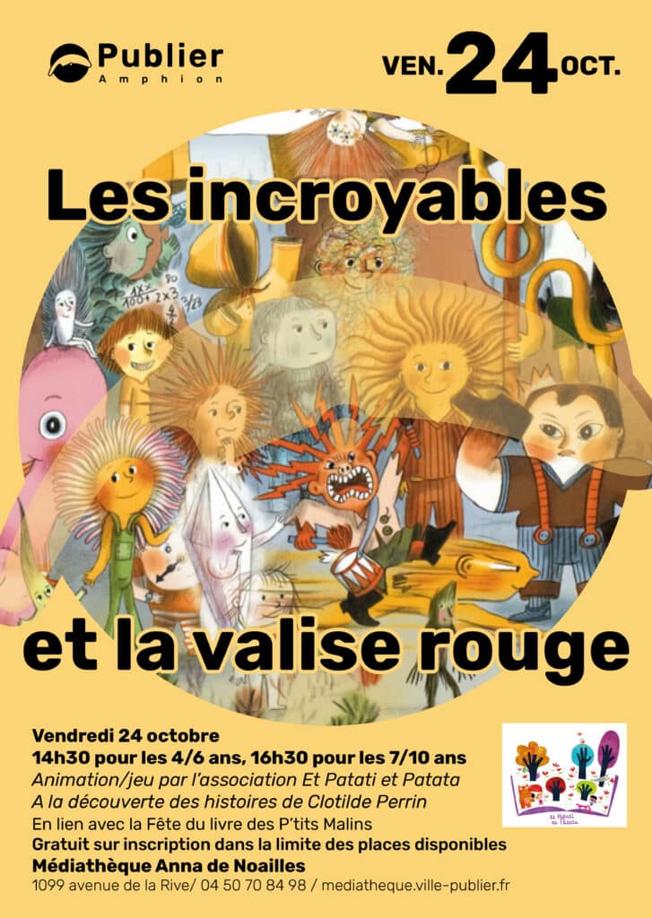 La médiathèque Anna de Noailles propose le vendredi 24 octobre, à 14h30 pour les 4/6 ans et à 16h30 pour les 7/10 ans, une animation/jeu avec l’association Et Patati et Patata autour des histoires de Clotilde Perrin.