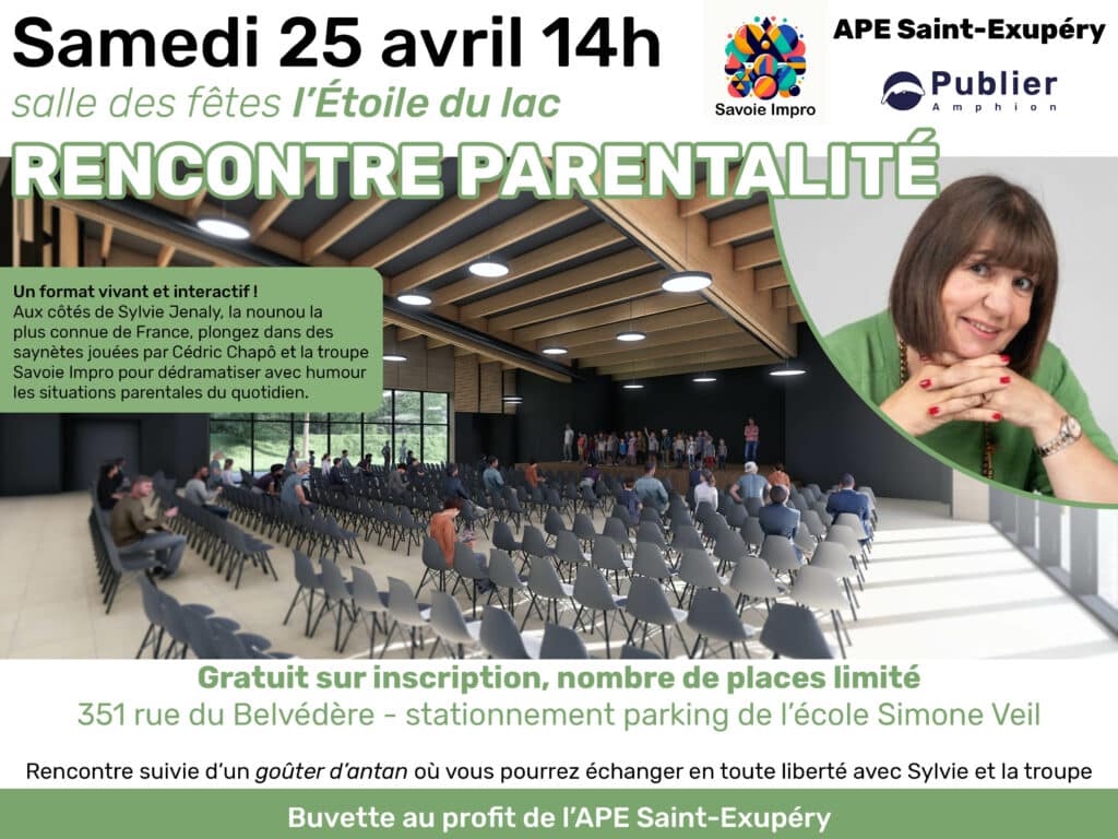 Le rendez-vous sera animé par Sylvie Jenaly, la nounou la plus connue de France et la troupe Savoie impro qui abordera avec humour les situations parentales du quotidien. La rencontre sera suivie d’un goûter d’antan, buvette au profit de l’APE Saint-Expéry.