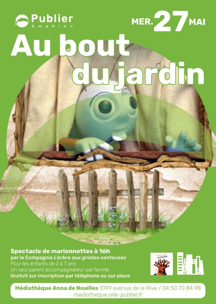 La médiathèque Anna de Noailles propose le spectacle de marionnettes Au bout du jardin de la compagnie L’arbre aux griotes conteuses le mercredi 27 mai à 16h pour les enfants de 2 à 7 ans.
