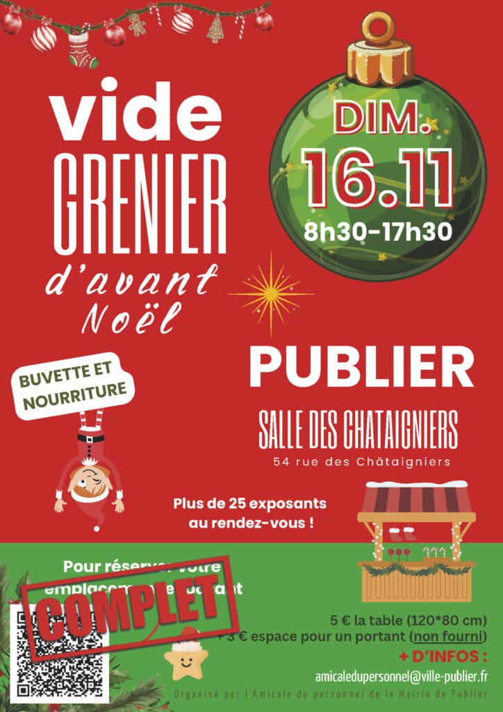 L’amicale du personnel de la Ville de Publier organise un vide-grenier d’avant Noël le dimanche 16 novembre de 8h30 à 17h30 à la salle des Châtaigniers, 54 rue des Châtaigniers Publier.