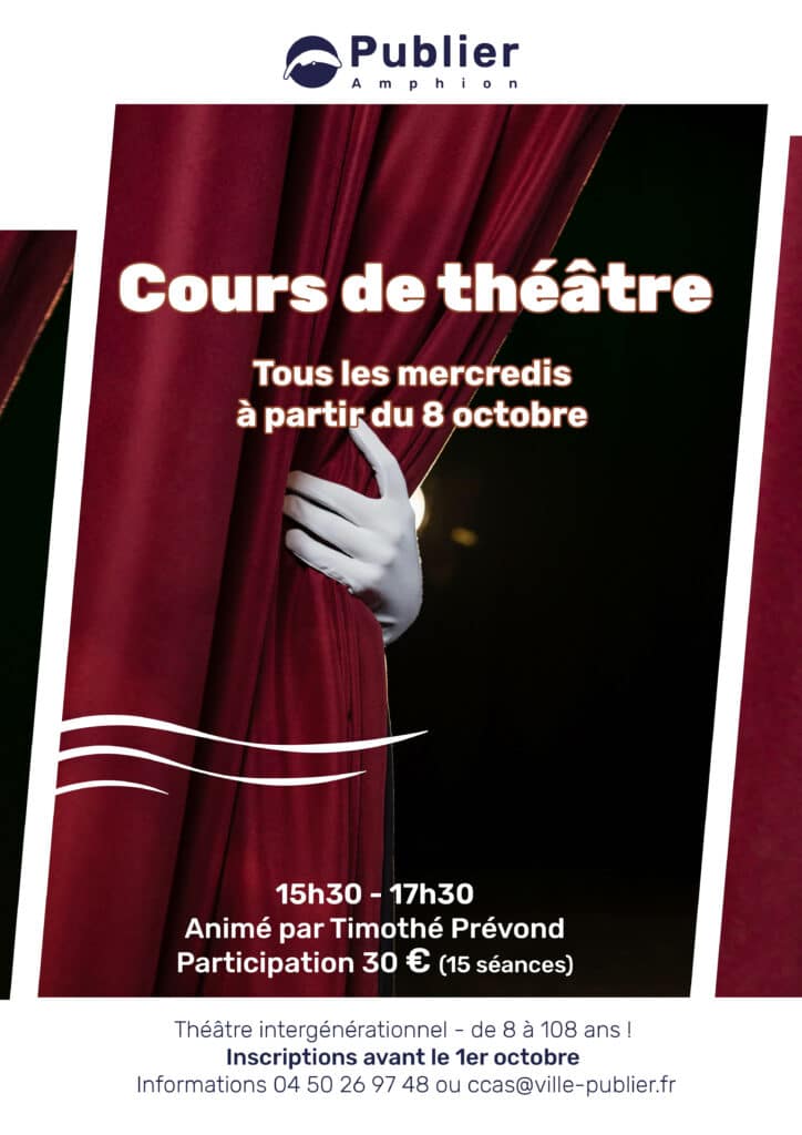 Le CCAS de Publier propose un cycle de 15 séances de cours de théâtre à l’adresse de toutes les générations, les mercredis de 15h30 à 17h30 à partir du 8 octobre. Ateliers animés par Timothé Prévond, intervenant théâtre professionnel.